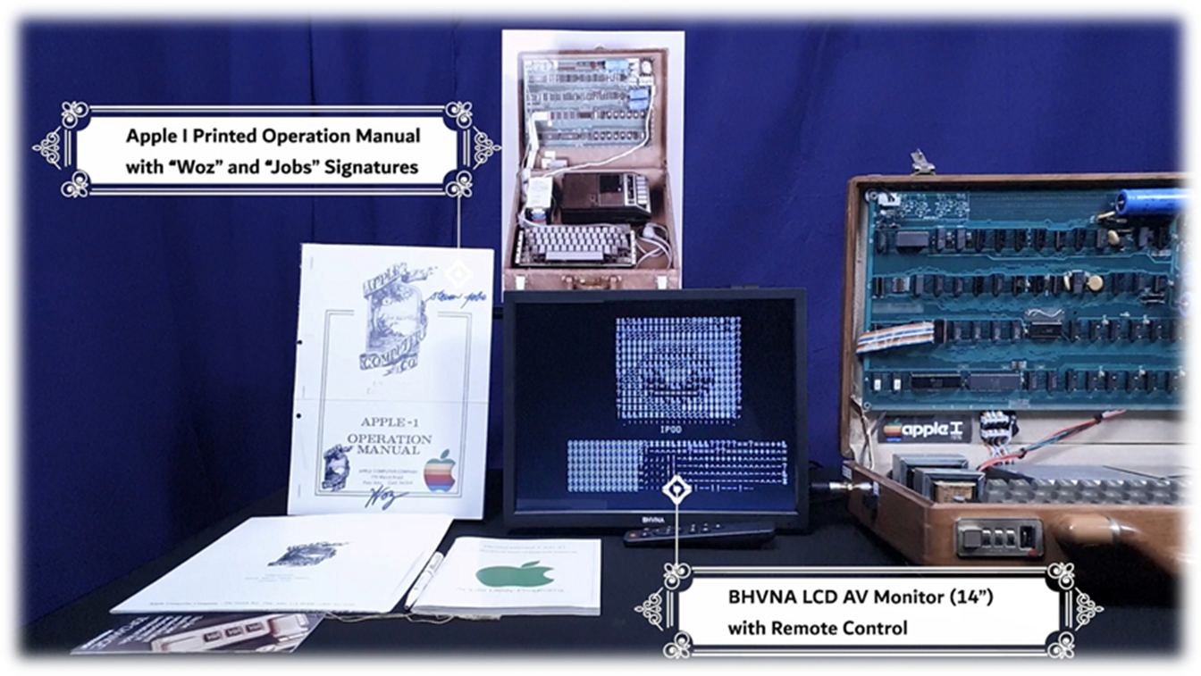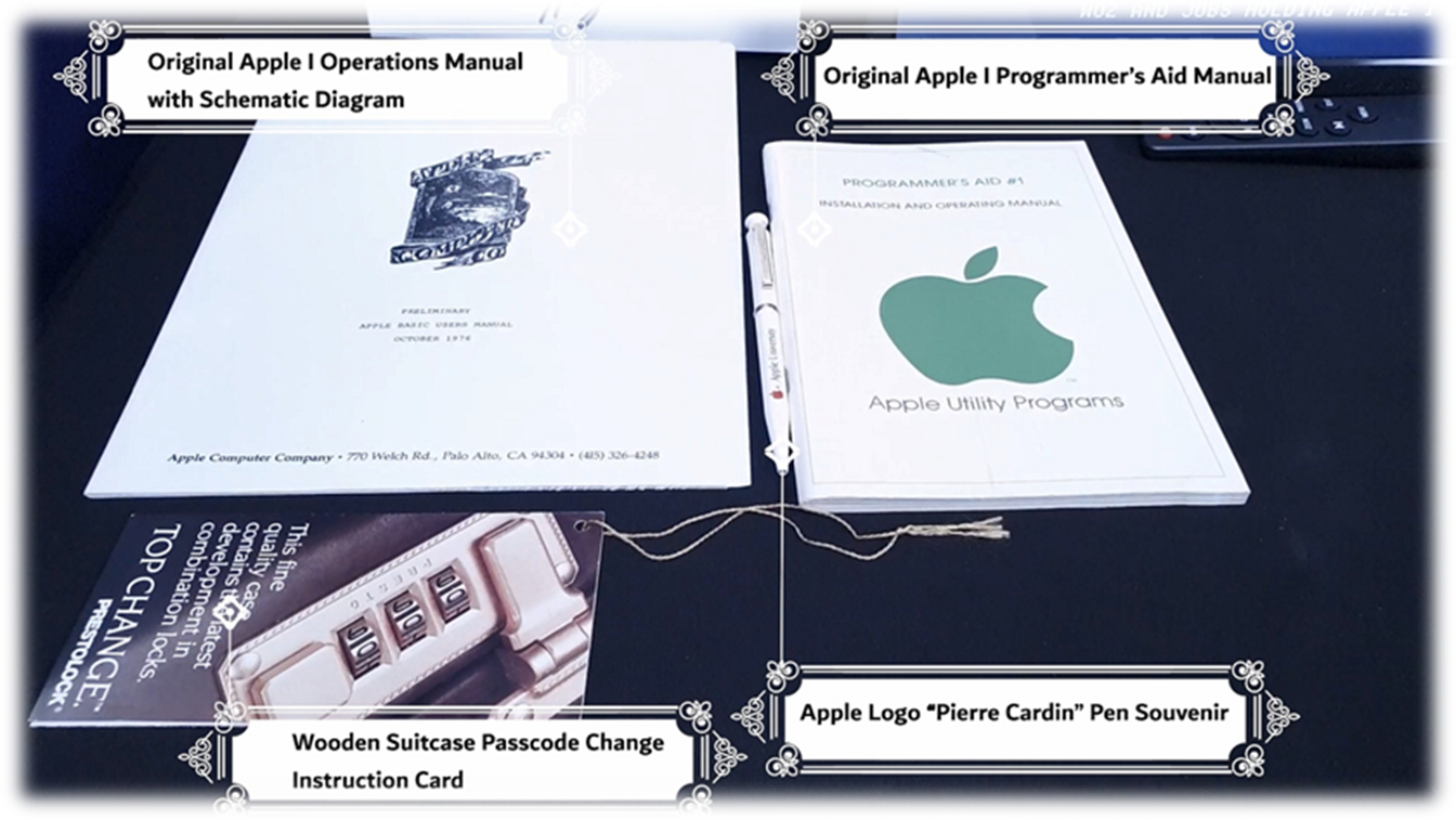 · Apple I Operations manual with schematic diagram · Original Apple I Programmer’s Aid manual · Apple Pierre Cardin Pen souvenir |