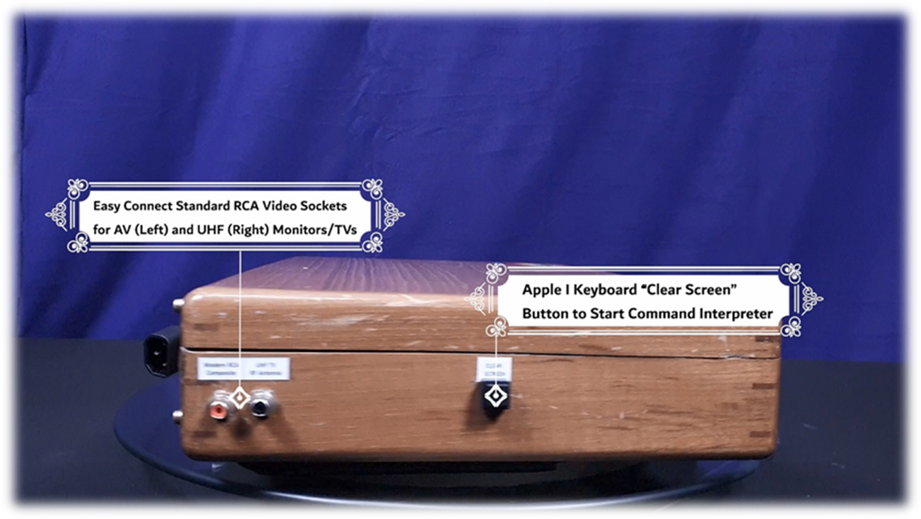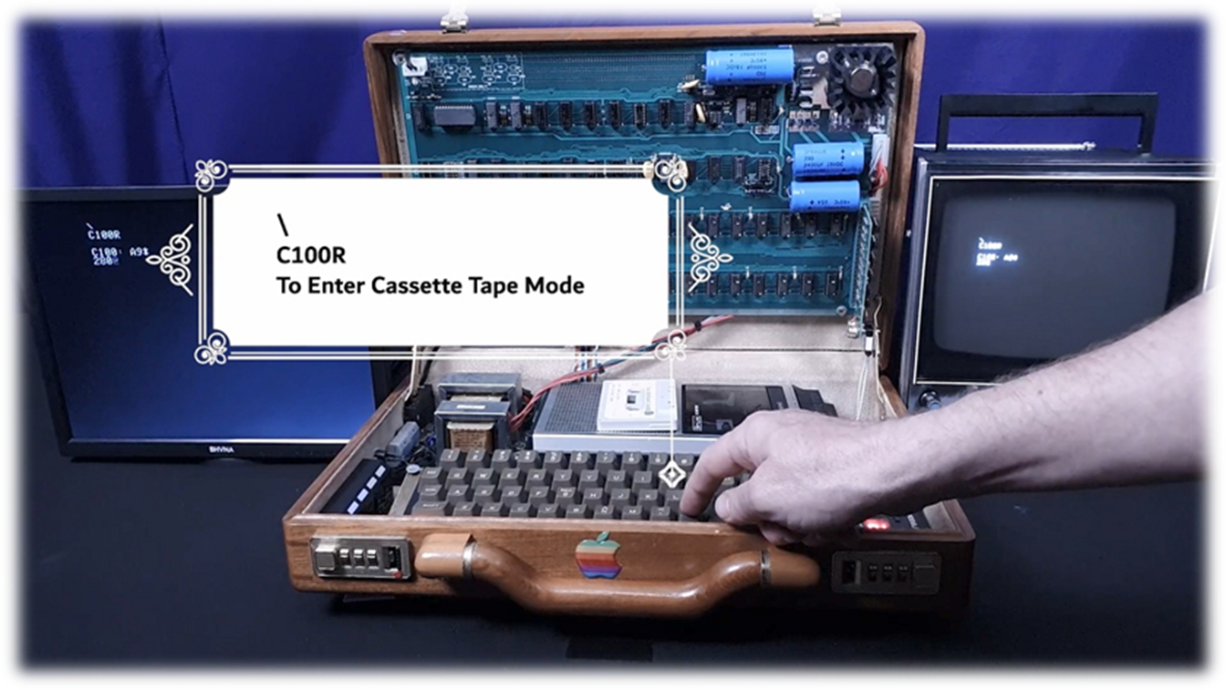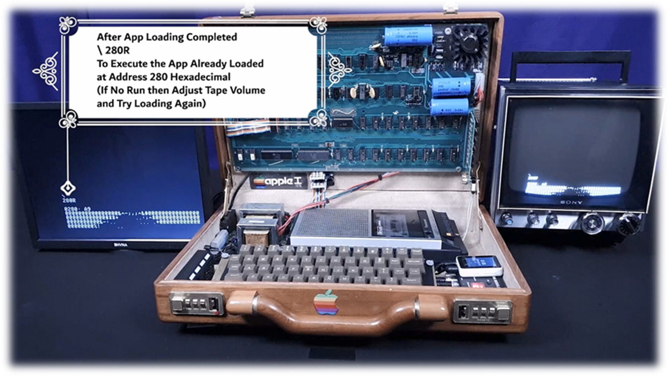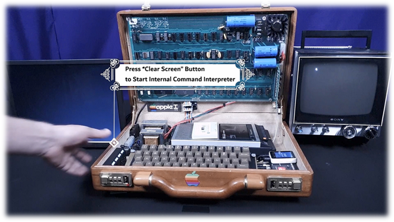 · On Startup: blinking @ signs filling screen · Press ClearScreen black button integrated left of the case · Press RESET key to start commands · C100R : to enter cassette load/save mode · 280.FFFR : then press cassette tape to load demo text photos program · RESET : any time to break run · Load software from default cassette tape player or switch cassette IN cable to integrated media player with 100s of Apple 1 applications and games · Keep cassette player volume level low (3-4) and Tone (7-8) for better program loading and recognition (analog to digital conversion) |