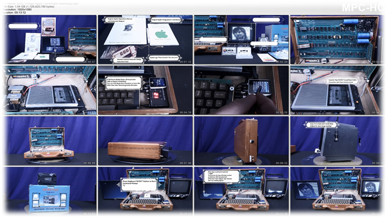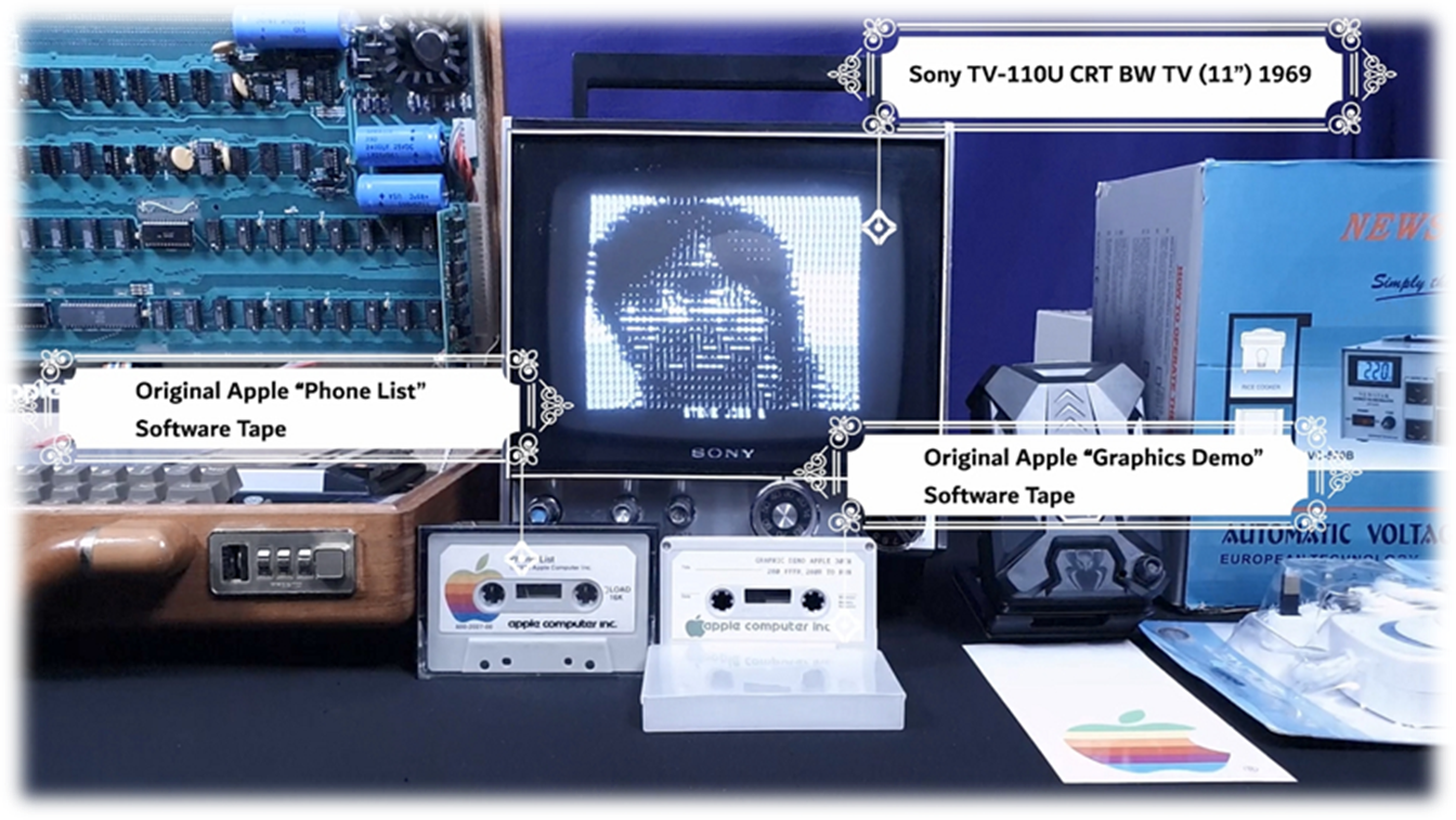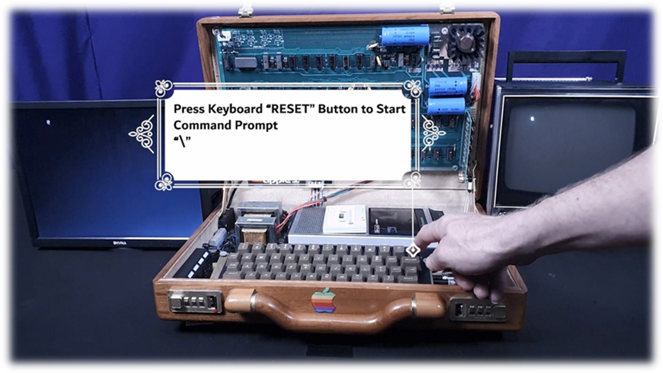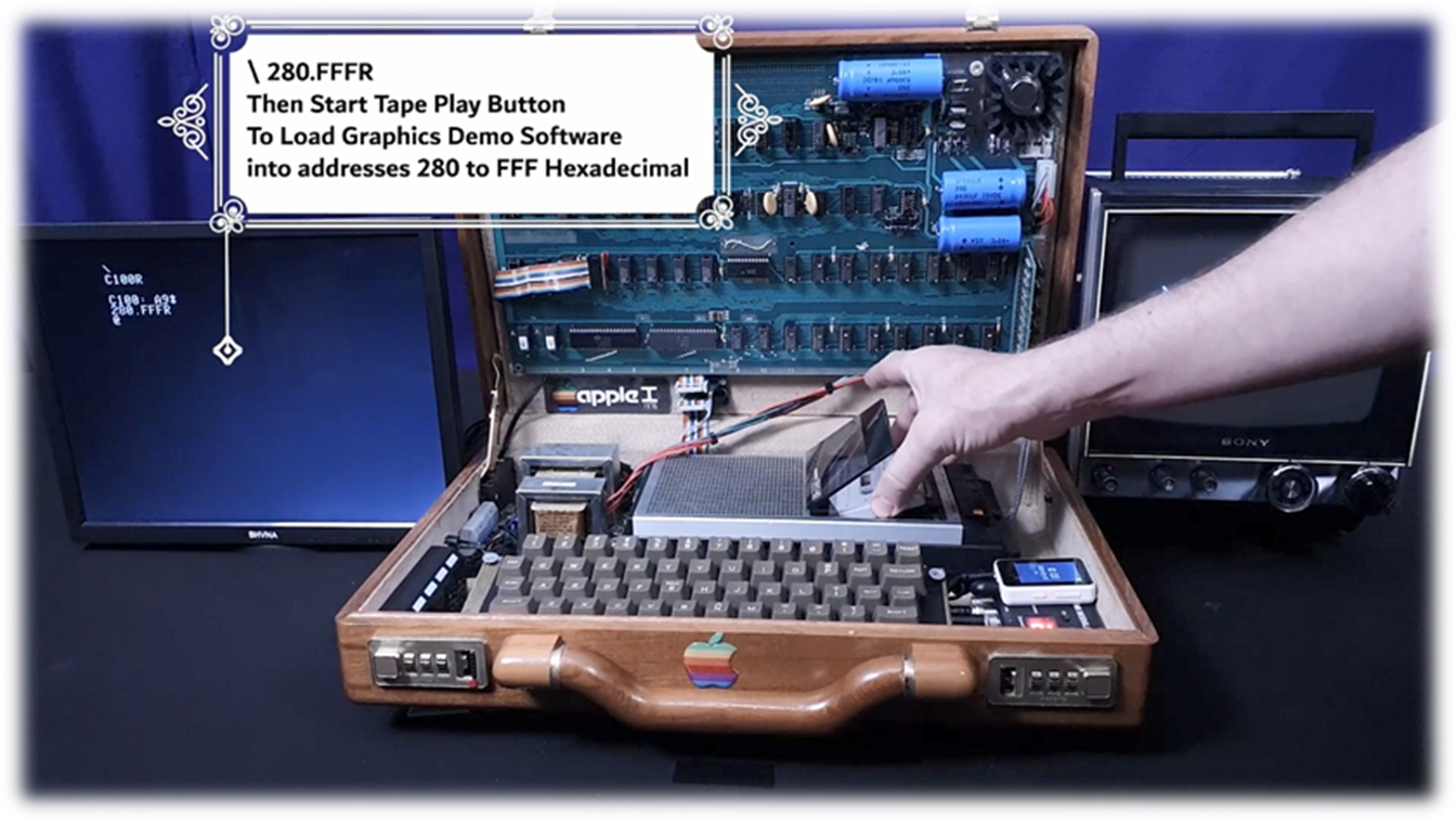 · On Startup: blinking @ signs filling screen · Press ClearScreen black button integrated left of the case · Press RESET key to start commands · C100R : to enter cassette load/save mode · 280.FFFR : then press cassette tape to load demo text photos program · RESET : any time to break run · Load software from default cassette tape player or switch cassette IN cable to integrated media player with 100s of Apple 1 applications and games · Keep cassette player volume level low (3-4) and Tone (7-8) for better program loading and recognition (analog to digital conversion) |