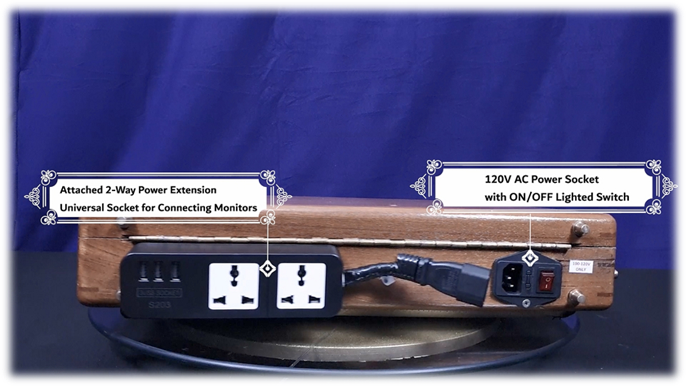 · Computer: 1 detachable power cable 120V only, integrated 2 power sockets 120V, Plug Type: TYPE B, USA, 2 Thin Flat + 1 Thick Round Pins · Sony TV-110U Monitor 1: 120V only, Plug Type: TYPE A, USA, 2 Thin Flat Pins · BHVNA LCD Monitor 2: 100-240V auto-switch, Plug Type: TYPE F, UK, 2 Thick Round Pins · Power Transformer: 500VA Power Transformer included (120V-240V Manual Switch), Plug Type: TYPE G, UK, 3 Thick Flat Pins |