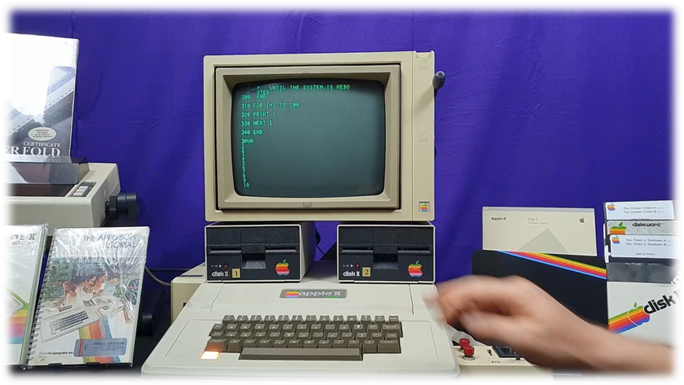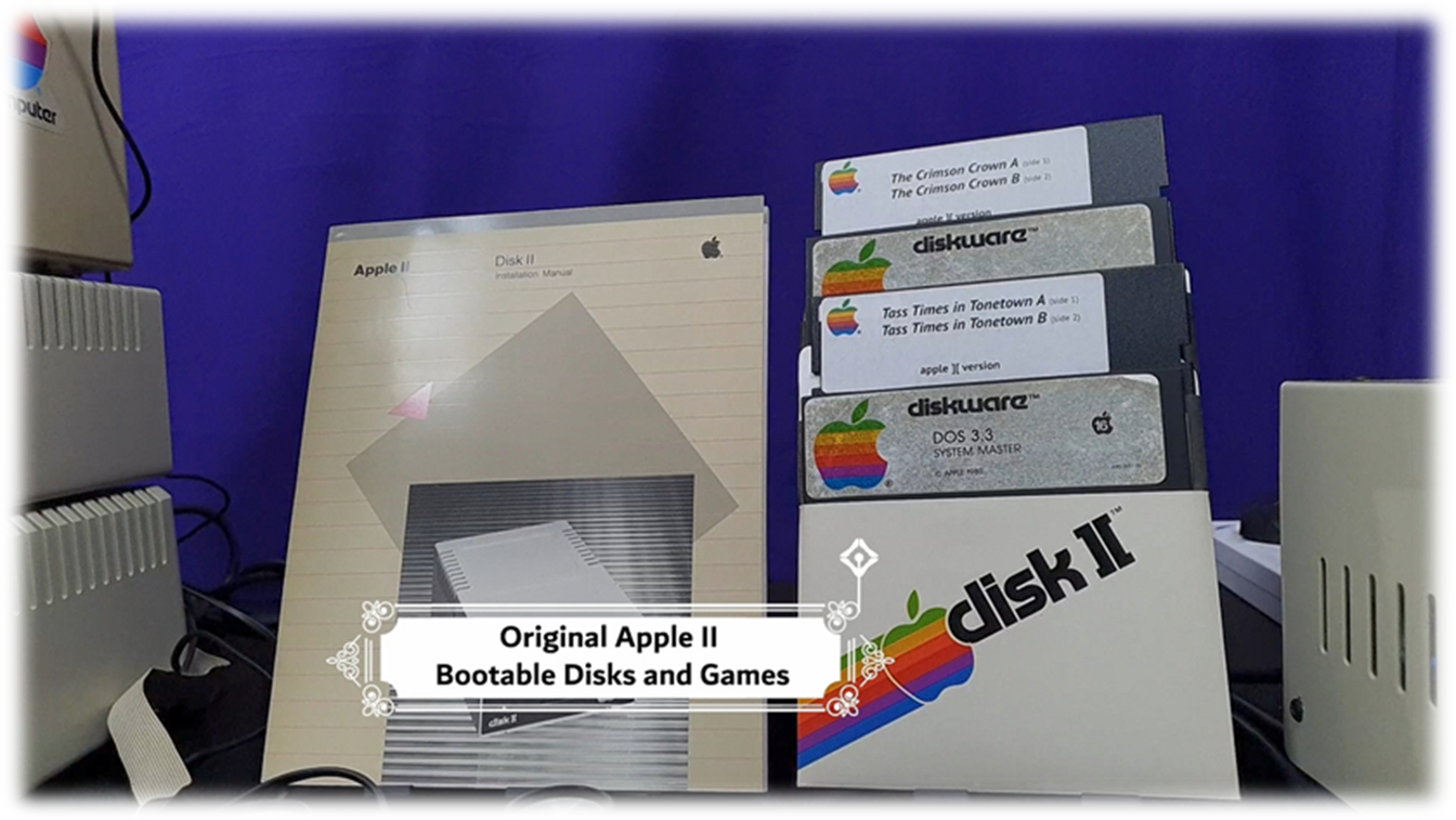 · 2 buttons Joystick + 2 Pedals · EPSON MX-80 dot matrix printer & Banner Fold Sealed Paper Pack · Apple Computer Metal Banner · Original Apple II Manuals: · Apple II Reference Manual with Foldout Schematic · The Applesoft Tutorial Manual & Errata · ProDos User’s Manual · Disk II Reference Manual · Apple II Bootable Disks Bundle (Diskware DOS 3.3, Tass Times in Tonetown Game, The Crimson Crown Game, DigDog Game) |