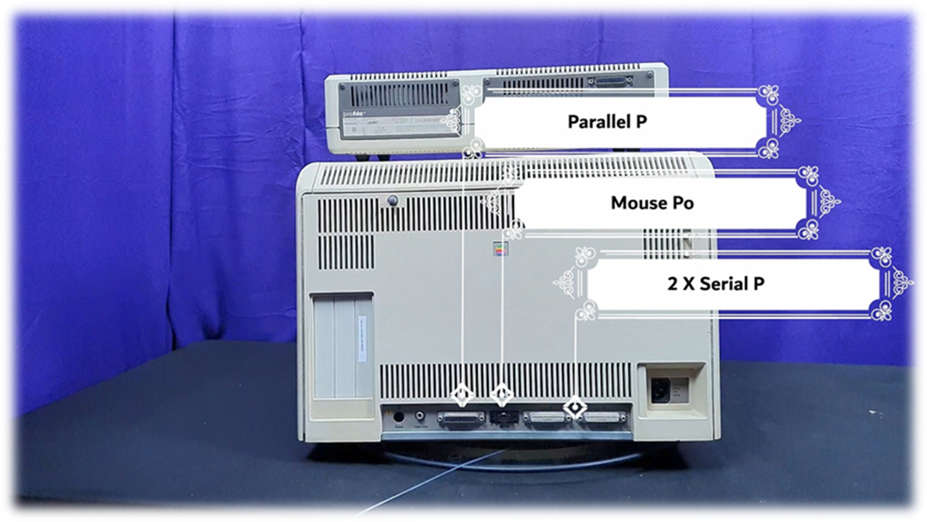 · 3 Proprietary Expansion Slots · Composite video · 1 DB-9 mouse port · 2 RS232 Serial Ports · DB-25 Parallel port (Printer, Apple Profile HDD) |