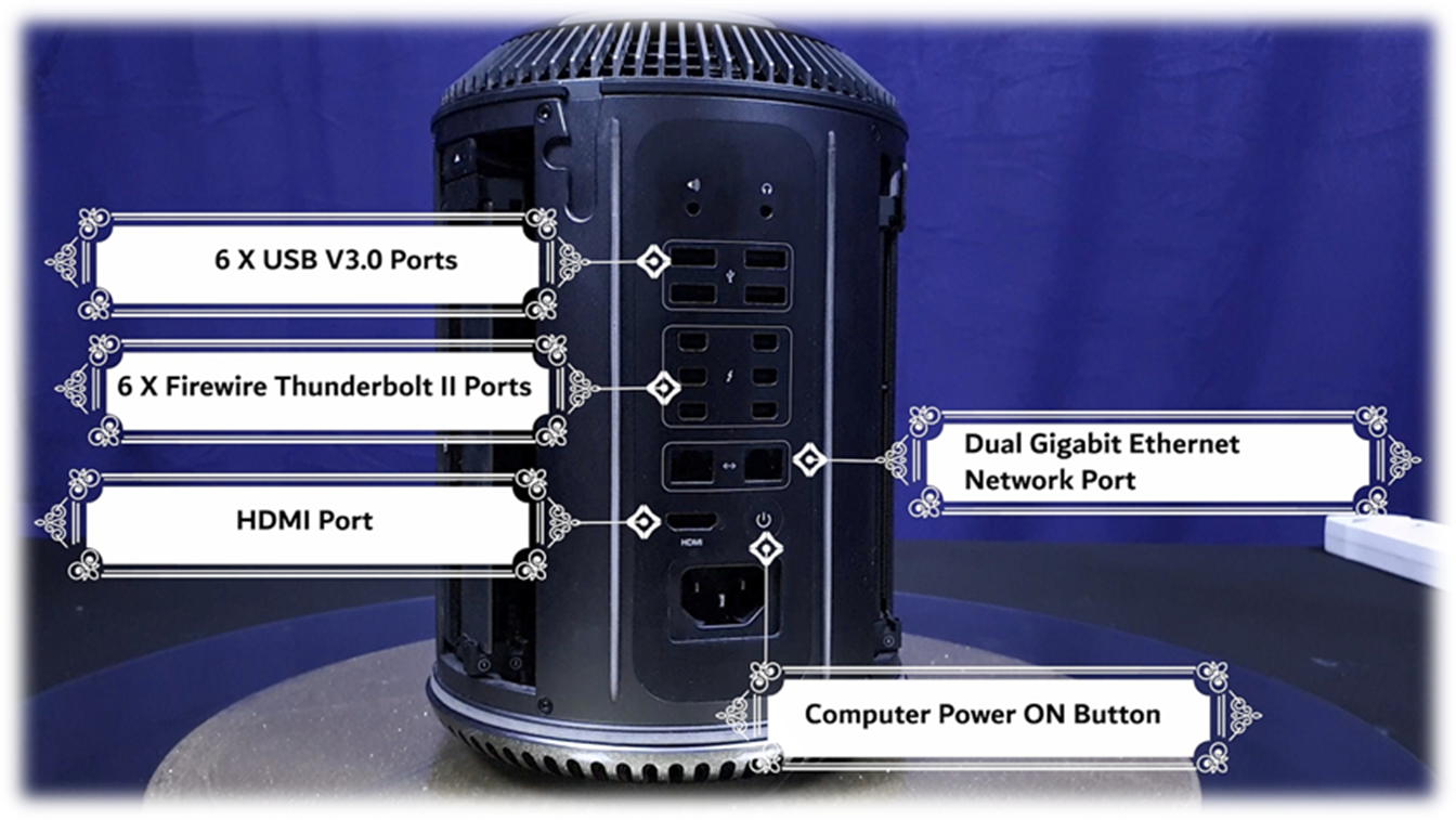 · 4 USB Ports v3 · 6 Firewire Thunderbolt 2 Ports · 1 HDMI port · Stereo 3.5 mm minijack audio sockets |