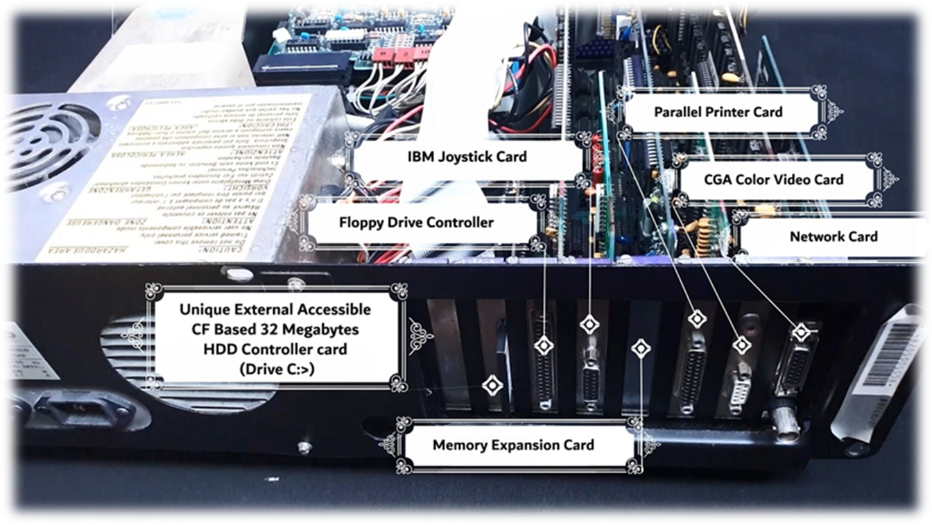 · CGA Color Video card · Network card · Serial I/O card · Parallel I/O card (printer) · CF based HDD drive controller · Original IBM Game Control Adapter 1501300 + PC Joystick |