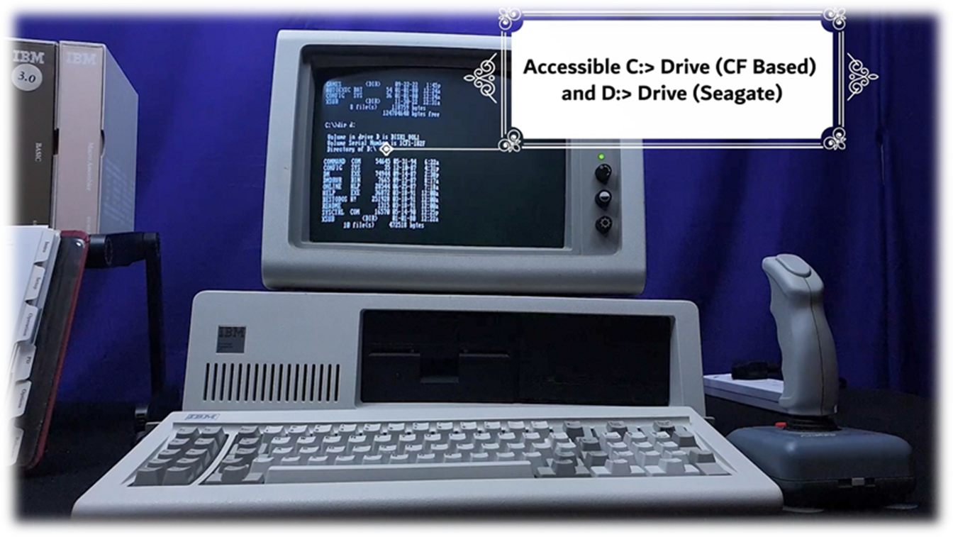 · On Startup: Select boot drive (XT-CF default, HDD, FDD) · Both HDD and XT-CF drives are accessible (C: , D:) · <DIR> : MS-DOS command to list current drive/directories files |