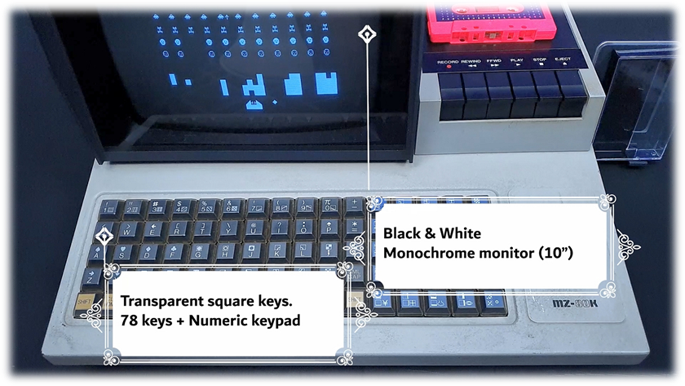 · Built-in black & white monochrome monitor (10") · Text: 40 x 25 (8 x 8 character matrix) · Graphics: 80 x 50 |