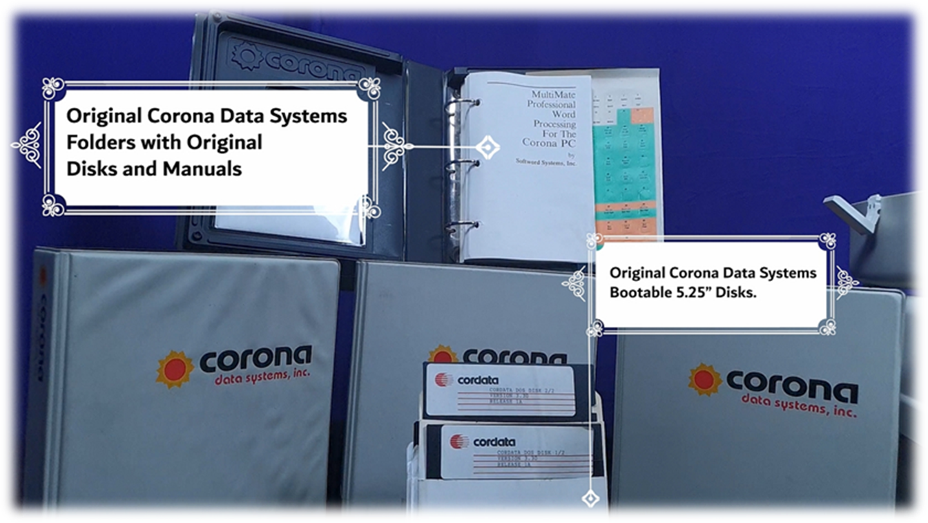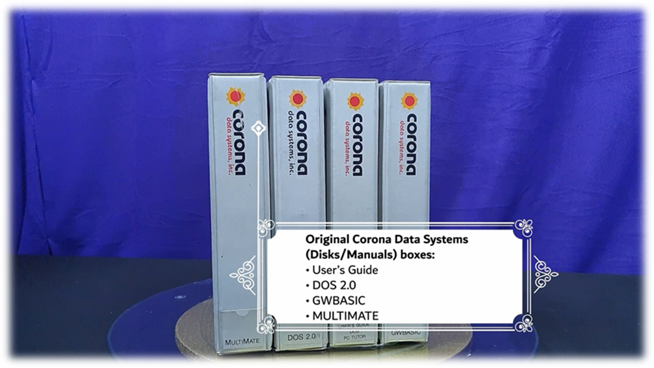 · Original Corona Data Systems (Disks/Manuals) boxes: · User’s Guide · DOS 2.0 · GWBASIC · MULTIMATE |