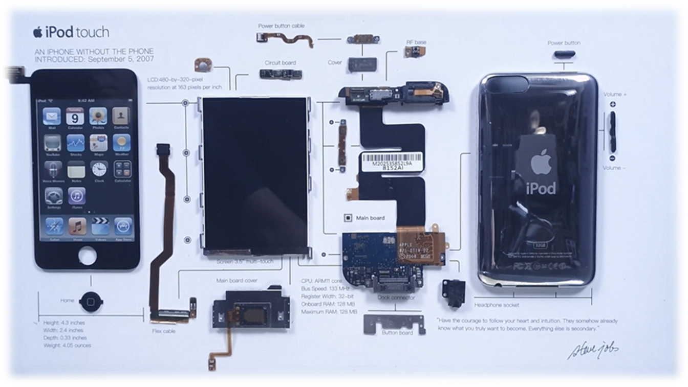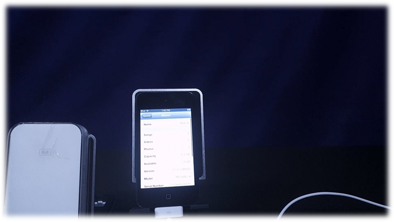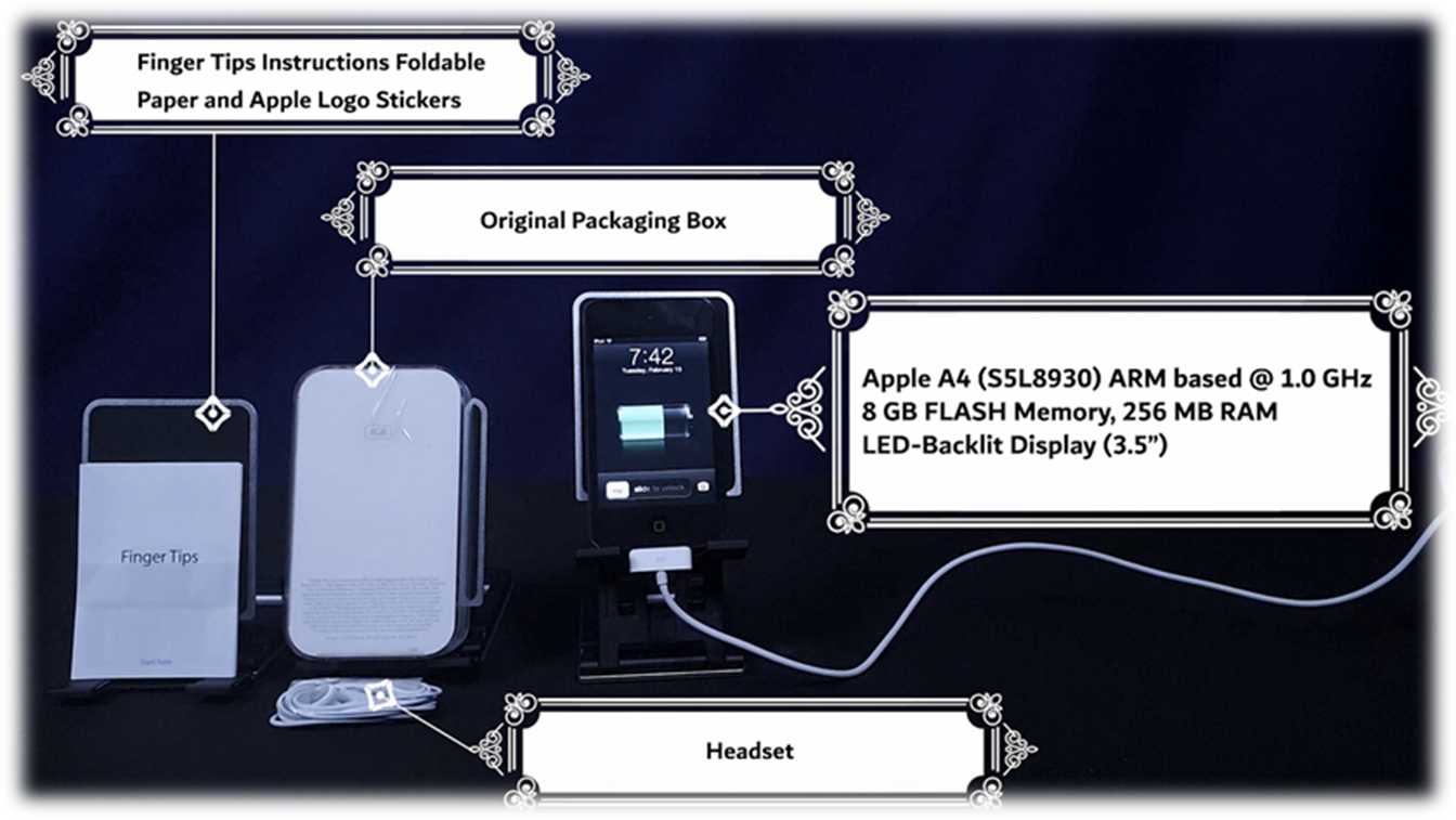 · AC Adapter · Charging/Syncing Cable · Headset · Original Glass Box · College Wooden Frame of Real iPod Touch Components |
