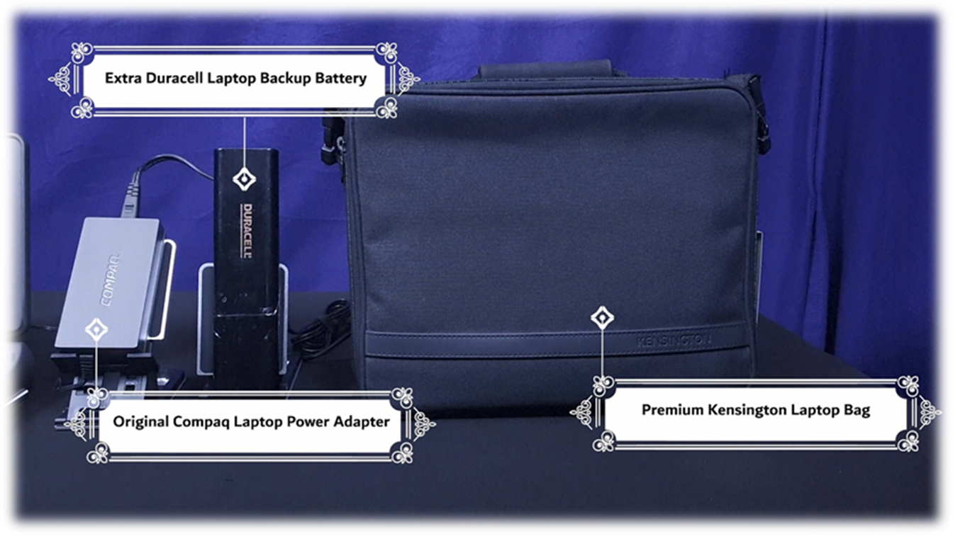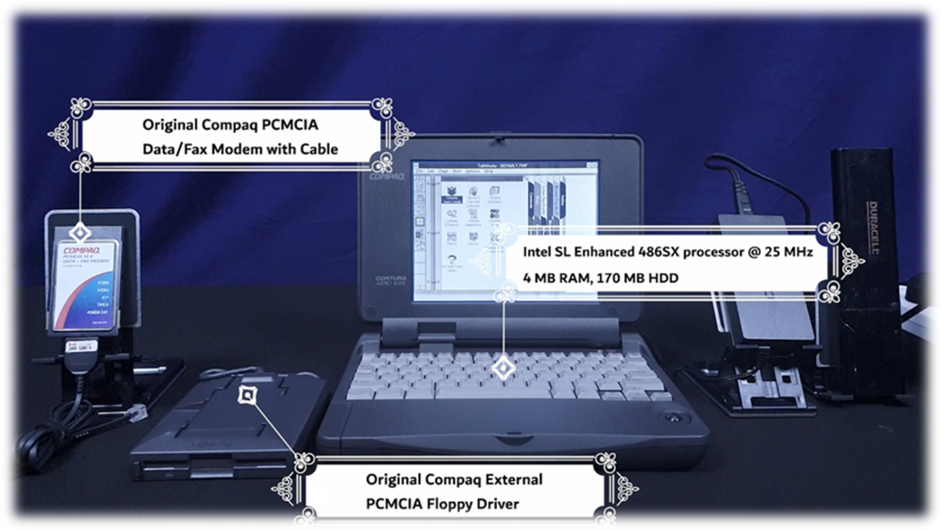 · Original Power Adapter (Series 2832A) · Original Compaq External Floppy Driver (Series 2833) · Original Compaq PCMCIA data/fax modem with cable · Original Compaq laptop battery + Duracell backup battery · Premium Kensington Laptop Bag |