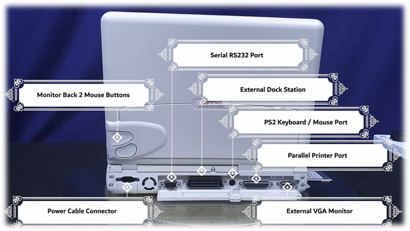 · External VGA monitor port · Parallel printer port · Serial RS232 port · PS/2 port · Docking connector |