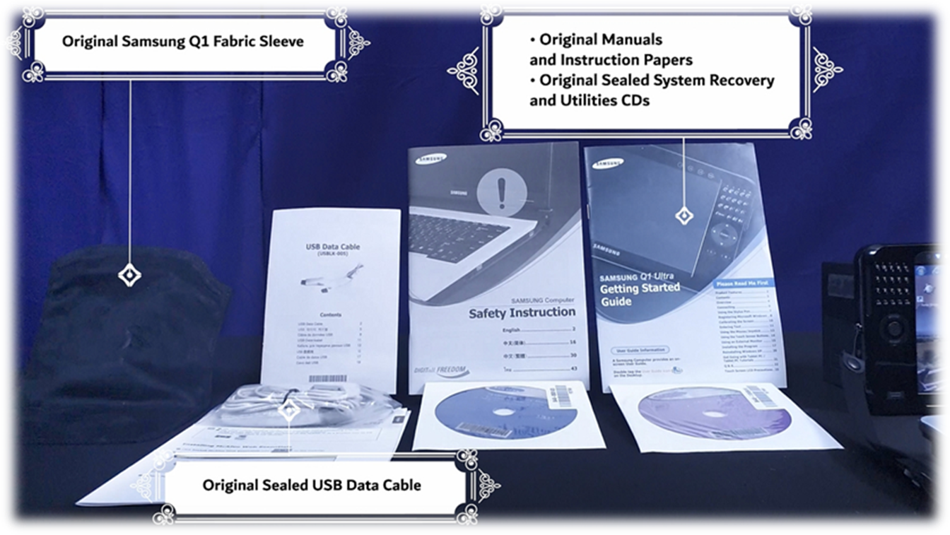 · Original Packaging Box and Inserts · Original AC Adapter · Original Stylus Pen · Original Samsung Hand Strap · Original Samsung Q1 Sleeve · Original Manuals and Instruction Papers · Original Sealed System Recovery and Utilities CDs |