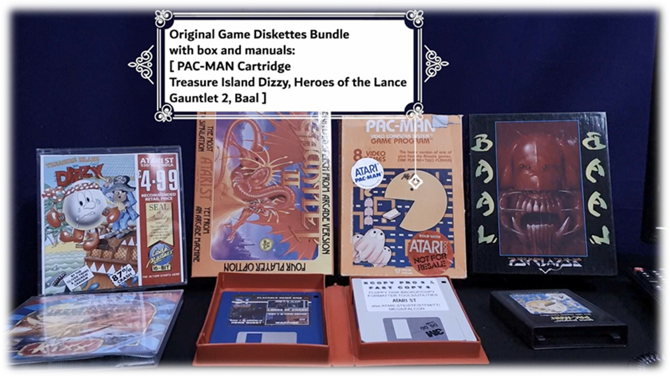 · Original Packaging Box, Inserts, and Manuals · Original Mouse · Original Game Diskettes Bundle with box and manuals: · PAC-MAN Cartridge, Treasure Island Dizzy, Dungeons & Dragons Heroes of the Lance, Gauntlet 2, Baal and The Seven Gates of Jambala |