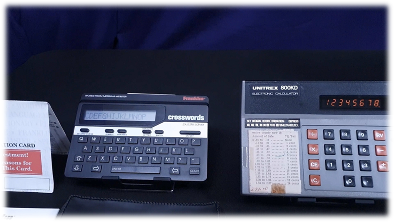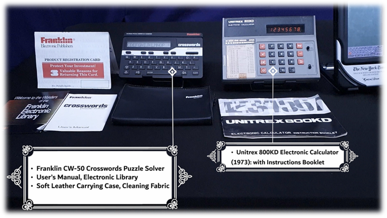 120V Only (Internal PSU) · Unitrex 800KD Electronic Calculator (1973): · Instructions Booklet · Excalibur The New York Times Touch-Screen Crossword Puzzle (2008) · Melcor 400 Electronic Calculator (1973) · Radio Shack EC-380 Calculator (1977) · Sperry Remington SSR-8 Calculator (1974) · Franklin CW-50 Crosswords Puzzle Solver (Merriam Webster) (1992): · User’s Manual · Franklin Electronic Library · Product Registration Card · Sealed Cleaning Fabric · Soft Leather Carrying Case |